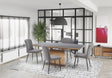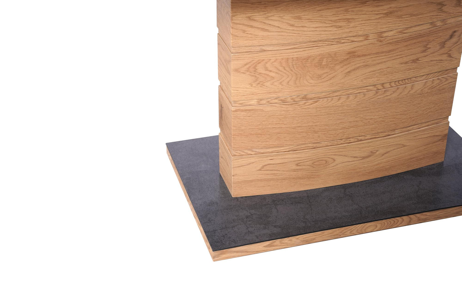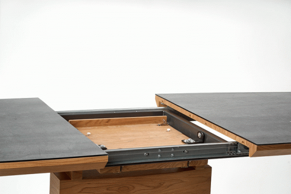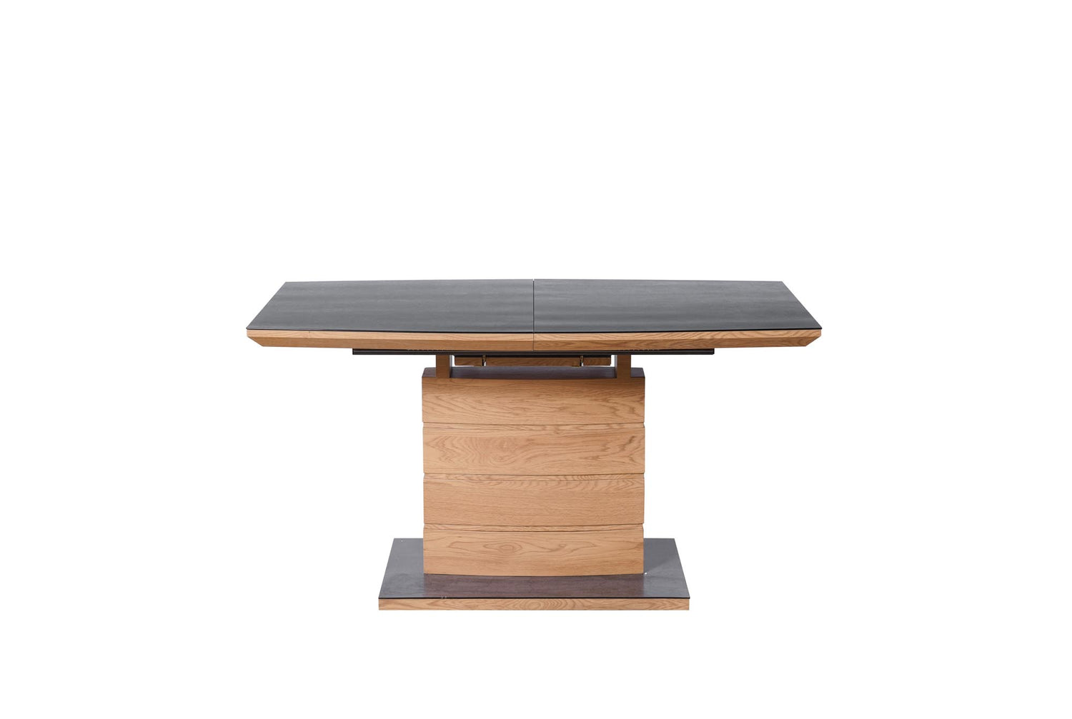 extension table, dimensions: 140÷180/80/77 cm, material: glass / laminated MDF, color: top - dark grey, leg - golden oak