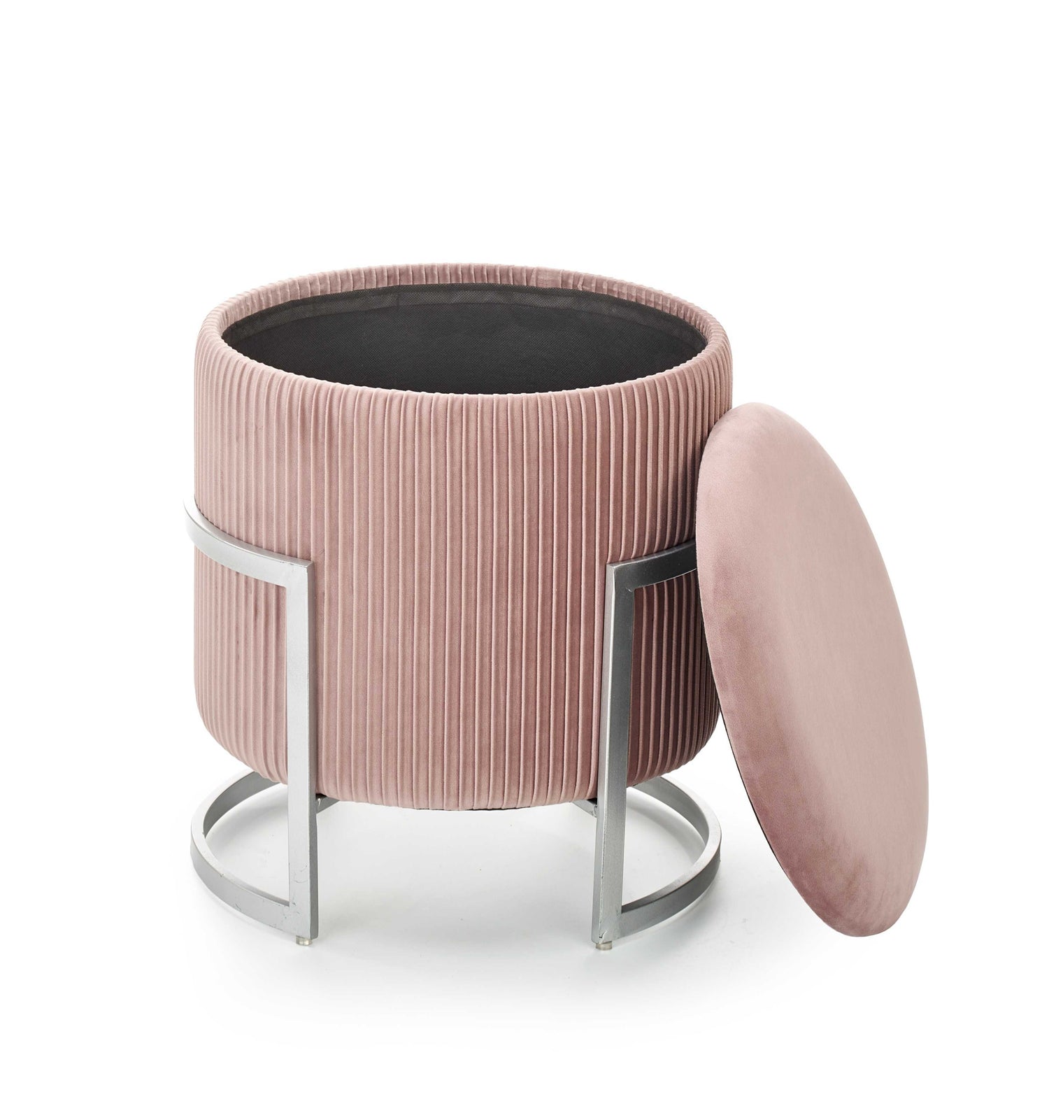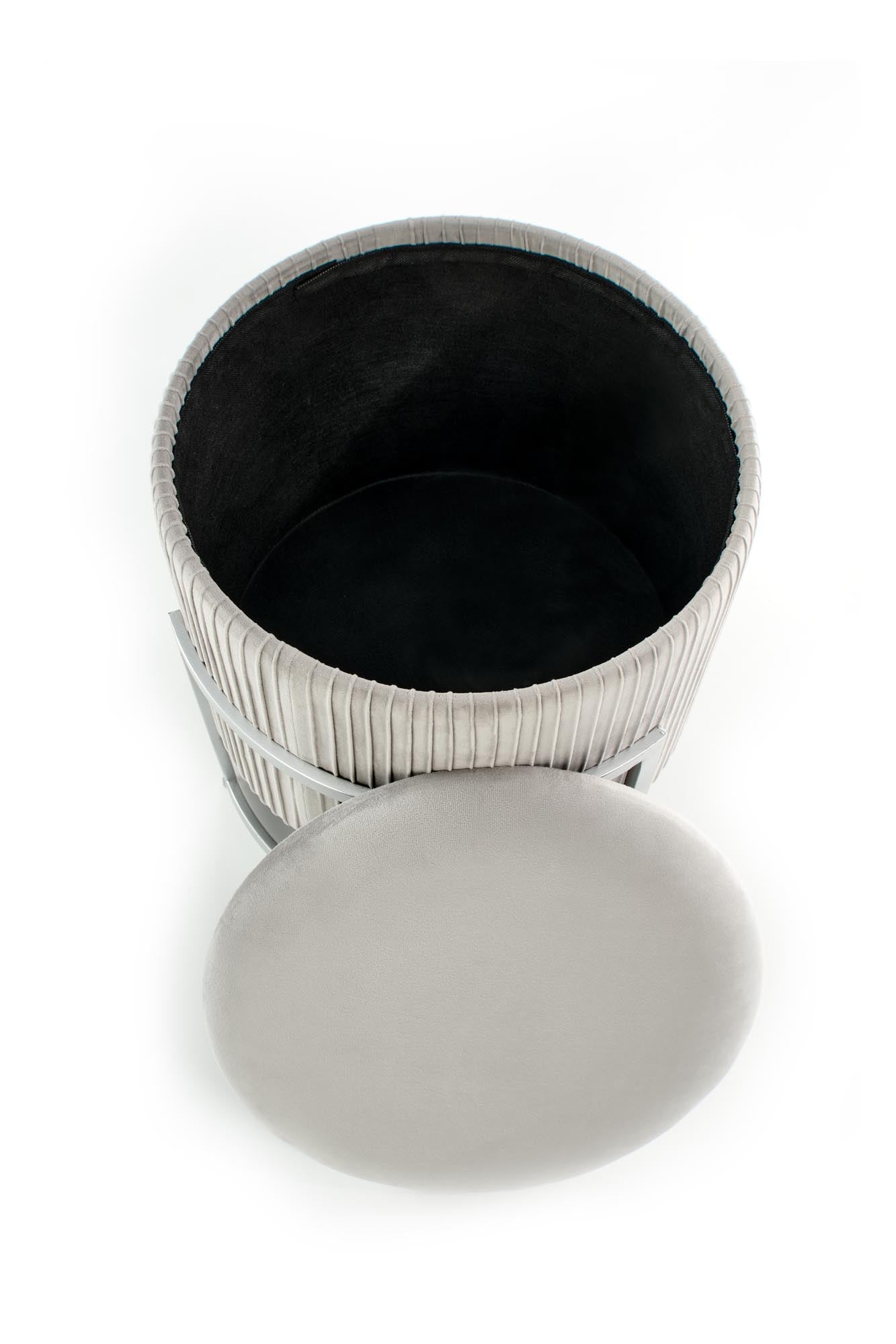 dimensions: fi40/46 cm, pouf with storage function, matarial: velvet cloth / powder coated steel, colors: light grey,
