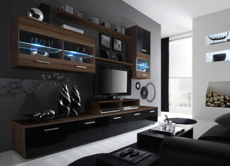Fronts: laminated high gloss MDF, tempered glass