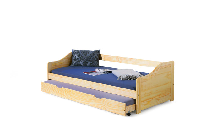 double bed with pull-out bottom mattress, dimensions: 209/96/65 cm, material: laquered pine wood, color: pine, bed without mattresses optional mattresses NEAPOL, dimensions: 200/90/12 cm