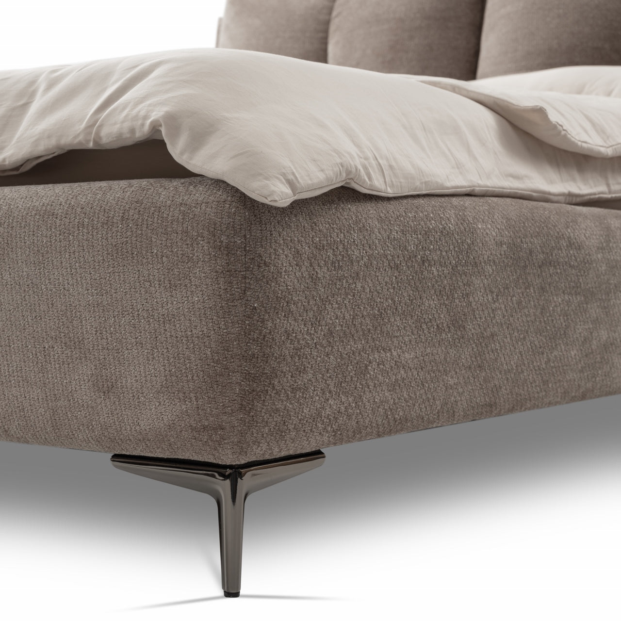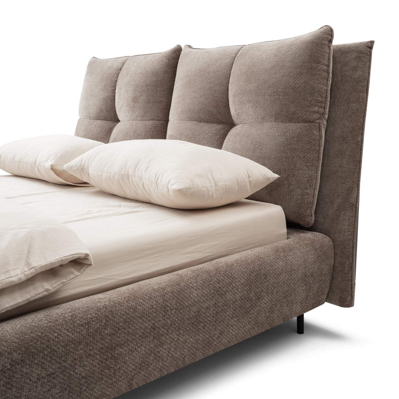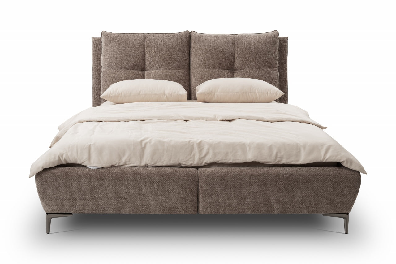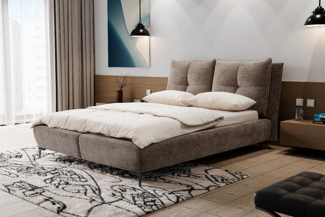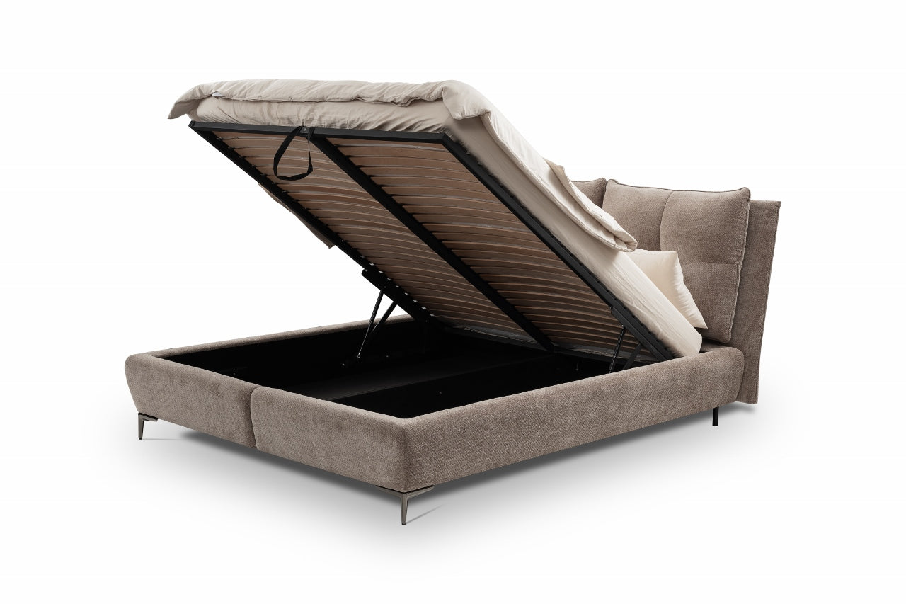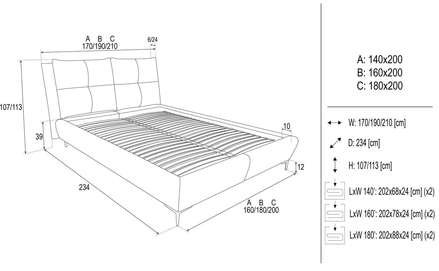 Stylishly designed bedroom bed with a bedding box. It is possible to choose the fabric and the size of the bed according to the given measurements. The mattress can be purchased separately.
